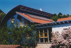 Home | Wir über uns | Projekte | Kontakt Umbau einer Scheune zur Arztpraxis mit Wohnung Kennzeichen: - Solarhaus, passiv und aktiv - Altbau als Grundlage für den Umbau - Wohnhaus, Praxis - ökologische Ansätze Haben Sie dieses Haus schon einmal gesehen? Voraussichtlich nur, wenn Sie Zahnschmerzen hatten und im Odenwald wohnen, denn da ist es sehr bekannt. Das Anwesen diente früher einem Baumeister (Maurer) als Wohnhaus, mit kleinem gewerblichen Bereich und einer kleinen Landwirtschaft zur Selbstversorgung. Notwendig wurde der Umbau durch die neu entstandenen Anforderungen und Bedürfnisse einer zeitgemäßen Zahnarztpraxis und den Wohnmöglichkeiten für die Familie. Es sollte alles getrennt sein, aber gleichzeitig auch miteinander verbunden bleiben. Das Architekturkonzept baut auf den vorhanden Gegebenheiten auf, beispielsweise dient die ehemalige Scheune heute als Garage für ein Wohnmobil, und das ursprüngliche Wohnhaus wurde zur zweigeschossigen Praxis. Treppen und verglaste Verbindungen fügen die einzelnen "Häuser" zu einem Ganzen zusammen, wobei der Ess-Wohn-Bereich mit Holzofen hallenartig den Mittelpunkt darstellt. Höfe, Gärten und Schuppen werden mehrfach über die Wohnräume mit Treppen und Terrassen angebunden. Die Naturheilpraxis ist innenarchitektonisch mit sehr viel Gefühl und Können von der Heilpraktikerin eingerichtet worden und hinterläßt einen ganz besonderen und angenehmen Gefühlseindruck. Das Haus ist als "Selbstversorger" konzipiert, Verglasungen nach Südwesten dienen der passiven Sonnennutzung, Vakuumkollektoren sorgen für Wärme und Nutzwasser. Die Kollektoren bedienen über eine Regel- und Speicherstufe die Fußbodenheizung, was eine äußerst effiziente Energienutzung ermöglicht und somit sowohl die Umwelt als auch die Finanzen schont. Die Gesamtarchtitektur wurde zuerst sehr kritisch beäugt, ist aber inzwischen mehr als akzeptiert, und die Befürchtung, durch die Design- und Architektursprache Patienten zu verlieren, hat sich nicht bestätigt, eher das Gegenteil ist eingetreten. |