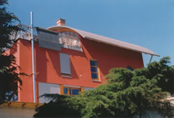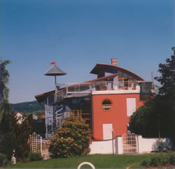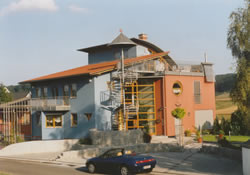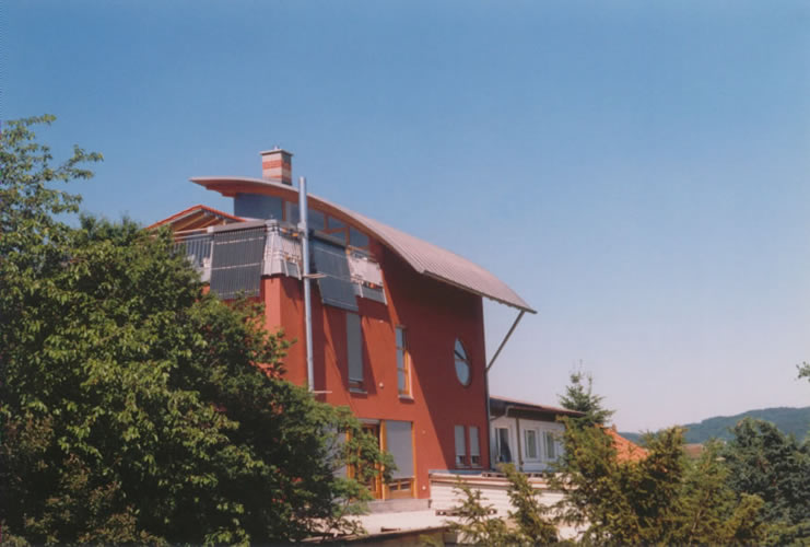 Es handelt sich hierbei um einen Umbau, das Haus wurde auf die Fabrikhalle eines Unternehmens für Form- und Werkzeugmaschinen aufgesetzt. Es ist in Massivbauweise auf das vorhanden gewesene Tragwerk aufgebaut. Das Bogendach mit seiner Dachterrasse ergibt auch aus der Ferne eine interessante Silhouette. Es unterstützt durch die mutige Farbgestaltung in blau und rot, die dem Haus den Charakter eines Geschlechterturms verleiht, das Selbstverständnis und die Bedeutung der Bewohnerschaft, die zu den größten Arbeitgebern der Region gehört. Die Architektur des Hauses entspricht sowohl innen als auch außen dem "Holzhaus Odenwald" und kann als dessen Vorläufer gesehen werden.