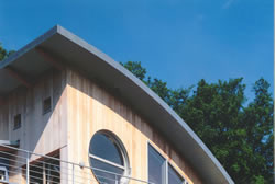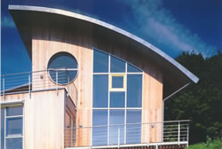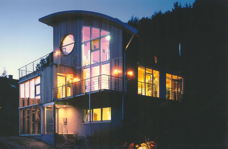 Home | Wir über uns | Projekte | Kontakt Holzhaus Odenwald Sie wollen dieses Haus bauen? Klicken Sie hier! Kennzeichen: - Holzhaus, Wohnhaus - urheberrechtlich geschützt - ökologisches Bauen - passive Sonnennutzung - hoher Anteil an Eigenleistung möglich - thematische Beziehung zu "Odenwälder Holzdialog" IGO + Odenwaldkreis - ausgewähltes Projekt für deutschlandweite Image- Kampagne des Holzabsatzfond + ARGE Holz Haben Sie dieses Haus schon einmal gesehen? Es ist sehr bekannt und wird unter anderem vom Holzabsatzfond deutschlandweit für die Propagierung von gelungener und zeitgemäßer Holzarchitektur mit ökologischem Anspruch verwendet. So wurde bzw. wird es beispielsweise im Magazin "Focus", aber auch in einer ganzen Anzahl von anderen Bau- und Wohnzeitschriften sowie auf Großplakaten in vielen Bundesländern abgebildet. Das Haus ist aus Holz gebaut und entspricht durch die Materialwahl und Konzeption ökologischen und solarenergetischen Gesichtspunkten, bei höchsten Wärmedämmansprüchen. Das Dach ist als Bogendach mit Begrünung ausgeführt, kann allerdings auch mit Tonziegel oder Stehfalzblech, je nach Bebauungsplan, ausgeführt werden. Die Außenwände sind mit verschiedenen Holzschalungen versehen, die Wärmedämmungen bestehen aus Holzfaserplatten. Die Baumassen sind differenziert, Terrassen und Balkons verbinden sich harmonisch mit dem Baukörper und dem Terrain. Im Kontrast zum Holzbau stehen die leichten und filigranen Stahlkonstruktionen der vorgenannten Balkons, Geländer und Terrassen. Die Verglasung nach Südwesten ist für den Gewinn von Sonnenenergie konzipiert (passive Sonnennutzung), dahinter befindet sich eine Pufferzone zur Regulierung der Solarwärmegewinne. Gleichzeitig wird dieser Raum als Treppenhaus und Grünhaus (Wintergarten) genutzt, der Bereich kann mittels Schiebetüren, je nach Temperatur, zu den Wohnräumen geöffnet oder geschlossen werden. Bei dem Einsatz von Holzpelletöfen kann wegen der sehr guten Wärmedämmung auf eine teure Zentralheizung verzichtet werden. Das Haus ist so konstruiert, daß es von jedem qualifizierten Zimmereigeschäft unter Verwendung der Pläne gebaut werden kann, wobei bei der Konstruktion darauf geachtet wurde, dass ein hoher Anteil an Eigenleistung möglich ist. Wenn Sie dieses Haus bauen wollen, klicken Sie bitte hier. Informationen hierzu über das Architekturbüro. Veröffentlichungen/Bildnachweis: - Focus, Heft 037, 10.09.01 - Holzabsatzfond, Broschüren: - "Bauen mit Holz" - "Fenster aus Holz" - "Bauen mit Holz in Kommunen" - Regionalpost, Heft 003, 09.01 - Das Haus, Heft 010, 10.09.01 - Lesezirkel, Heft 038, 17.09.01 - Mein Eigenheim, Heft 004, 12.11.01 - Ökohaus, Heft 006, 12.11.01 - Bauen, Heft 012, 28.11.01 - Das Einfamilienhaus, Heft 002, 14.11.01 - Wohnen im eigenen Heim, Heft 004, 12.11.01 - Lesezirkel, Heft 047, 19.11.01 - Kalender 2002 etc. Außerdem hängen Großplakate des Projekts "Holzhaus Odenwald" im Zeitraum September bis Dezember in den Regionen Bayern, Sachsen, Thüringen, Rheinland Pfalz, Nordrhein Westfalen, Niedersachsen und Schleswig Holstein. |