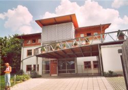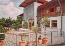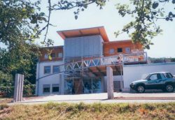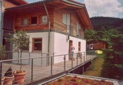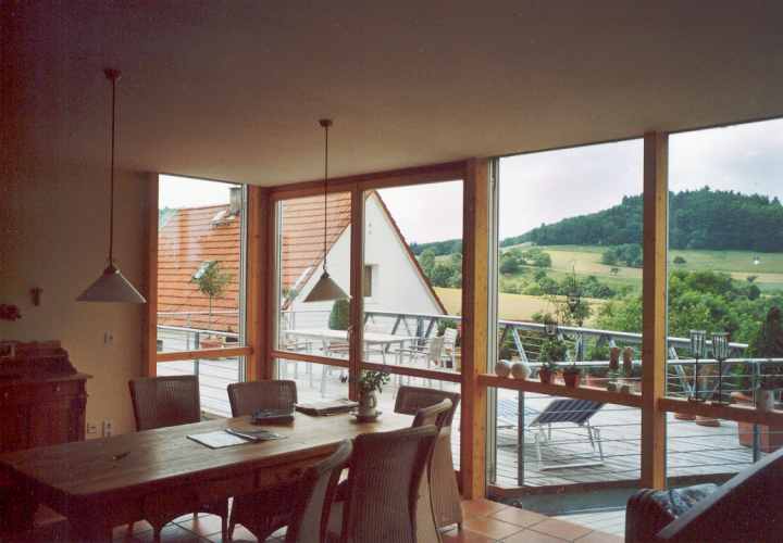Home | Wir über uns | Projekte | Kontakt Modernes Landhaus, Fam. Reiß Kennzeichen: 2. Preis des Odenwaldkreises für vorbildliches Bauen im Jahr 2OO2 - Großzügigkeit - Repräsentativ - Passive Sonnennutzung - Erdwärmeheizung - Kachelofen mit Koch- und Brateinrichtung - Ökologische Bauweise - Mischbauweise Holz, Ziegelstein Haben Sie dieses Haus schon einmal gesehen? Es ist im malerischen Ostertal (Odw.) etwas versteckt an einer Bergwiese mit dem Namen "Almende" mit herrlicher Aussicht gelegen. Allgemein Das Haus dient einer großen Familie und ist entsprechend konzipiert, der Bauherr ist Zahnarzt und technikverliebt, alle haustechnischen Errungenschaften durften daher einfliesen. Wobei anzumerken ist, das alle Technik dem familiären Wohnen dienen musste; dafür sorgte die Bauherrin. Die Hanglage wurde so ausgenutzt, dass talseits der Keller aus dem Erdreich heraustritt. Darüber liegt ein großer Balkon als Stahlkonstruktion mit Stegverbindungen zur Bergseite des Hauses, diese Konstruktion dient als Umgang und steht in direkter Verbindung mit dem Erdgeschoss, der Innenraum ist somit mit dem Außenbereich überall verwoben. Im Erdgeschoss werden die Funktionen Wohnen, Essen, Kochen in einem teilbaren "Großraum" zusammengefasst; dieser ist großzügig verglast und öffnet sich zum Tal und zu der Großterrasse. Energiekonzept Das Haus ist mit einer Erdheizung versehen, die über vier 99 m tiefe Erdbohrungen die E-Wärmepumpe mit ca. 11-13 Grad warmem Wasser versorgt, der Wirkungsgrad ist 1:4 . Die Verteilung erfolgt über die Fußböden, als Niedrigtemperaturbeheizung. Zusätzlich verfügt das Haus über einen zentralen Kachelofen, der computergesteuert den Abbrand optimiert und über die modernste Regeltechnik verfügt und damit einen extrem hohen Wirkungsgrad erzielt. Die großflächige Fassadenverglasung von ca. 7x9m, ist mit Spezialglas ausgeführt und dient der passiven Sonnennutzung, die gesamte Fläche ist mit Sonnenschutz versehen. Architektur und Konstruktion Das Erd- und Untergeschoss ist in 36,5 cm Porenziegelstein ausgeführt, das Obergeschoss ist als Holzrahmenbau mit 16 cm (Dach 24 cm) Wärmedämmung versehen. Die Decken sind teilweise als Holzstapeldecken ausgeführt. Die Verglasungen liegen auf Holzkonstruktionen, alle Fenster sind in Lärche massiv ausgeführt, ebenso die Blanken für die Terrassen. Die Innentüren sind als Füllungstüren in Fichte mit Blockrahmen schreinermäßig angefertigt. Die 5 Bäder haben die Bauherrschaft ganz unterschiedlich und - teils mit spanischen Fliesen in herrlichen Farben - ausstatten lassen. Fußböden sind teilweise in Holz und Terrakotta ausgeführt Innen- und Außenputze sind mineralisch. Sämtliche Wände, sowohl im Massivbereich wie auch im Holzbereich sind "atmend" d.h. diffusionsoffen ausgeführt. Die integrierte Garage ist mit einem Gründach versehen, das Hauptsdach ist mit Tonziegel und Titanzinkblech ausgeführt. Veröffentlichungen/Bildnachweis: - 2. Preis des Odenwaldkreises für vorbildliches Bauen im Jahr 2002 - Odenwälder Echo 20. Dez. 2002 |