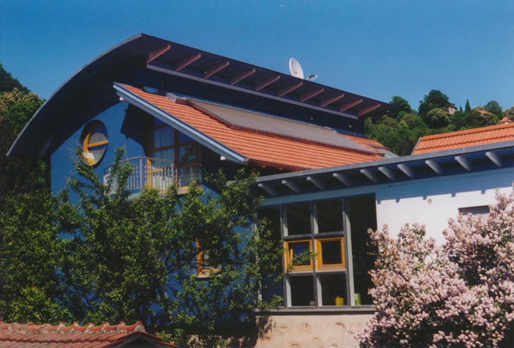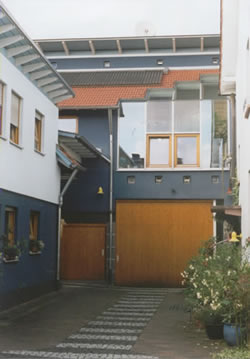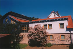 Home | Wir über uns | Projekte | Kontakt Umbau einer Scheune zur Arztpraxis mit Wohnung Kennzeichen: - Solarhaus, passiv und aktiv - Altbau als Grundlage für den Umbau - Wohnhaus, Praxis - ökologische Ansätze Haben Sie dieses Haus schon einmal gesehen? Voraussichtlich nur, wenn Sie Zahnschmerzen hatten und im Odenwald wohnen, denn da ist es sehr bekannt. Das Anwesen diente früher einem Baumeister (Maurer) als Wohnhaus, mit kleinem gewerblichen Bereich und einer kleinen Landwirtschaft zur Selbstversorgung. Notwendig wurde der Umbau durch die neu entstandenen Anforderungen und Bedürfnisse einer zeitgemäßen Zahnarztpraxis und den Wohnmöglichkeiten für die Familie. Es sollte alles getrennt sein, aber gleichzeitig auch miteinander verbunden bleiben. Das Architekturkonzept baut auf den vorhanden Gegebenheiten auf, beispielsweise dient die ehemalige Scheune heute als Garage für ein Wohnmobil, und das ursprüngliche Wohnhaus wurde zur zweigeschossigen Praxis. Treppen und verglaste Verbindungen fügen die einzelnen "Häuser" zu einem Ganzen zusammen, wobei der Ess-Wohn-Bereich mit Holzofen hallenartig den Mittelpunkt darstellt. Höfe, Gärten und Schuppen werden mehrfach über die Wohnräume mit Treppen und Terrassen angebunden. Die Naturheilpraxis ist innenarchitektonisch mit sehr viel Gefühl und Können von der Heilpraktikerin eingerichtet worden und hinterläßt einen ganz besonderen und angenehmen Gefühlseindruck. Das Haus ist als "Selbstversorger" konzipiert, Verglasungen nach Südwesten dienen der passiven Sonnennutzung, Vakuumkollektoren sorgen für Wärme und Nutzwasser. Die Kollektoren bedienen über eine Regel- und Speicherstufe die Fußbodenheizung, was eine äußerst effiziente Energienutzung ermöglicht und somit sowohl die Umwelt als auch die Finanzen schont. Die Gesamtarchtitektur wurde zuerst sehr kritisch beäugt, ist aber inzwischen mehr als akzeptiert, und die Befürchtung, durch die Design- und Architektursprache Patienten zu verlieren, hat sich nicht bestätigt, eher das Gegenteil ist eingetreten. |