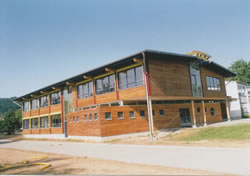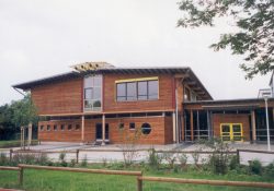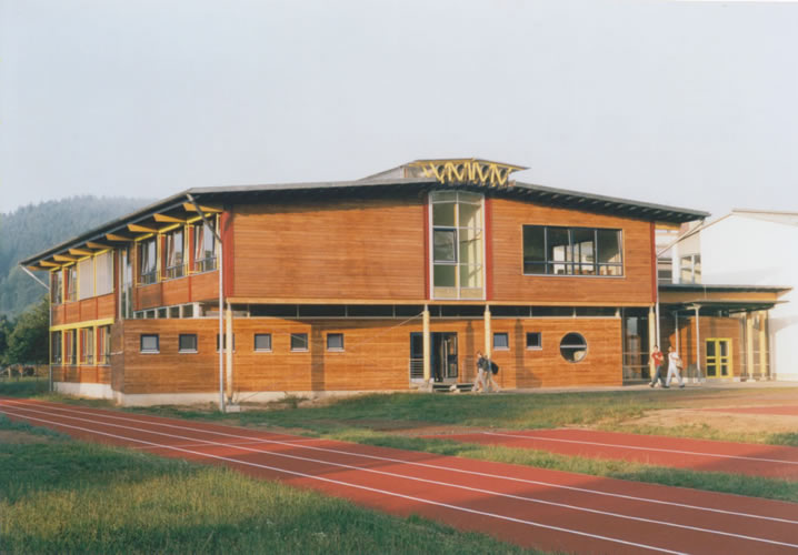 Home | Wir über uns | Projekte | Kontakt Schule in Holzbauweise mit Sonnenenergienutzung Kennzeichen: - Pilotprojekt - Schulgebäude zweigeschossig, aus einheimischem Holz - ökologische Ansätze - passive Sonnennutzung - Planungsbeteiligte: Stöcker und Petersson, Michelstadt - Bauherr: Kreisauschuß des Odenwalkreises - Projekt des "Odenwälder Holzdialoges" - Technische Angaben zum Energieverbrauch siehe unten Verbrauch Wärmeenergie 29,13 kwh/m² = ca. 2,91 l Öl/m² Haben Sie dieses Haus schon einmal gesehen? Gut möglich, mit Sicherheit, wenn sie Schüler oder Lehrer der Ernst-Göbel-Schule in Höchst/Odw. sind. Dort dient es als Gebäude für die Schüler der dortigen gymnasialen Oberstufe. Aber auch aus der "Regionalpost", einer Zeitschrift des "NABU Naturschutzbund Deutschland e.V.", des Umweltbundesamtes und des "Deutschen Verbandes für Landschaftspflege (DVL)" oder aus anderen südhessischen Zeitungsberichten könnten Sie schon etwas über diese Schule efahren haben. Lesen Sie doch einfach den Bericht aus der vor- genannten Zeitschrift "Regionalpost": Eine Schule aus dem Wald - Pilotprojekt Schule Höchst "Ohne unsere Erfahrung beim Bau von Ein- und Zweifamilienhäusern wäre ein Projekt wie die Höchster Schule nicht zu realisieren gewesen", weist Gesine Stöcker auf das Know how hin, das sich auch Architekten für den Holzbau aneignen müssen. Die Erweiterung der Höchster Ernst-Göbel-Schule ganz aus Holz ist eben ein Vorzeigeprojekt der gelung- enen Art. Entstanden sind die Pläne für den zweigeschossigen Erweiterungsbau in den Büros von Diplom-Ingenieur Heinrich Schäfer in Reichelsheim sowie den Diplom-Ingenieurinnen Dörte Petersson und Gesine Stöcker in Michelstadt. Die Zusammenarbeit war nötig, weil ein einzelnes Büro mit dem Projekt überfordert gewesen wäre, wie Gesine Stöcker erläutert. Zehn Klassenzimmer, dazu Toiletten, Lehrerzimmer und andere Räume sowie eine zehn mal zwanzig Meter große Halle für Veranstaltungen jeglicher Art ruhen auf gerade mal 36 Holzstützen. Das ansässige Handwerk konnte beim Bau durch abgestimmte Konstruktionen, Material- und Aus- schreiungsdifferenzierungen eingebunden werden. Zudem dürfte dies jene Schule im Odenwald sein, die aufgrund einiger Raffinessen am wenigsten Heizenergie benötigt. Auf dem Dach befindet sich ein riesiger, mit Plexiglas abgedeckter Kasten, fünf Meter breit und 33 Meter lang. Darin erwärmt Sonnenkraft Luft, die dann ins Gebäude geblasen wird. Somit ist gleichzeitig für Frischluftzufuhr in den Räumen gesorgt. Wenn schon Holz, dann auch zur Isolierung: Glaswolle wurde nur dort in die Wände eingebaut, wo es aufgrund der strengen Brandschutzvorschriften erforderlich war. Ansonsten dämmt Zellulose das als Niedrigenergiehaus ausgelegte Gebäude. Verbaut wurden rund 300 Kubikmeter Holz, das weitgehend aus den Forsten des Odenwaldes stammt. Die Architekten legten die Konstruktion so aus, dass teures Leimholz nur an wenigen Stellen eingebaut werden musste. Ansonsten tat es ganz normales, auf 18 Prozent Restfeuchte getrocknetes Bauholz. Zusammen mit Beplankung, Schalung oder Dämmung wurden etwa 1000 Festmeter Holz verarbeitet. Die Höchster Schule kam trotz aller architektonischer Rafinessen auf exakt 1760 Mark reine Baukosten pro Quadratmeter. Konventionell wäre das Gebäude zum Preis von 2000 bis 2200 Mark zu erstellen gewesen. Aus: Regionalpost September 2001, Katja Ewald und Bernd Blümlein Daten zu den einzelnen Energie- und Ressourceneinsparmaßnahmen: Baubetrieb Durch die Holzkonstruktion konnte gegenüber einer konventionellen Massivbauweise ca. 6O % Energieeinsatz und damit verbunden entsprechend CO2 eingespart werden. Grundlage der Schätzung sind vergleichbare Untersuchungen. Eine wissenschaftliche Untersuchung hierzu wird beauftragt. Wärmedämmung , Thermische Solaranlage, Lüftungskontrolle Die Dachbereiche sind mit 24 cm , die Wände mit 18 cm, der Boden mit 18 cm Wärmedämmung versehen, in Verbindung mit dem Solarkollektor konnte ein Heizölverbrauch von ca. 3 Liter je m2 Grundfläche gemessen werden. Bei der Solaranlage handelt sich um eine luftgeführte gebäudeintegrierte Großanlage mit ca. 165 m2. Sie dient weiterhin zur kontrollierten Be- und Entlüftung. Messbasis: Wärmemengezähler an Hauptzuleitung der Fernleitung. Verbrauch 437OO KWh von Mitte Sep. 2OO1 bis Mitte Mai 2OO2. Schulfläche 15OO m2, Ansatz : 1 Liter Heizöl = 1O kWh Energieinhalt (bei 9O% Wg) 437OO KWh: 15OO m2 = 29,13 KWh/m2 = ca. 2,91 l je m2 Kraftwärmekopplung KHKW Es sind insgesamt 5 KHKW Anlagen mit 5,5 KW thermischer und 11 KW elektrischer Leistung installiert., somit ist optimale Brennstoffnutzung gegeben, der Stromüberschuß wird mit in den anderen Schulgebäuden verbraucht. Wassereinsparung 25O Schüler verbrauchen je Tag ca. 25O x 5l Wasser , ergibt je Tag 1,25 m3, ergibt bei ca. 225 Schultagen ein Verbrach von ca. 281 m3 im Jahr. Dieser Verbrauch wird durch die Regenwassernutzungsanlage völlig abgedeckt. Steuerung und Regelung Die Solarkollektoranlage ist computergesteuert und mit der konventionellen Heizanlage verbunden, Vorrang hat die Solarkollektoranlage. Bau- und Betriebskosten Die Baukosten lagen unter DM 19OO, sie sind damit als äußerst günstig zu bezeichnen, durch die geringen Energiekosten ist ein sehr wirtschaftlicher Betrieb möglich. Sonstiges Gründachbereiche, ökologische Bauweise, Energiesparbeleuchtung, Eine Photovoltaikanlage ist geplant Veröffentlichungen: - OHZ 27.03.2001 - OHZ 21.04.2001 - Darmstädter Echo April 1996 - Regionalpost 2001 - Frankfurter Rundschau 11.10.2000 - AiD, Bonn, Heft 4/2003 |