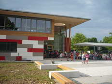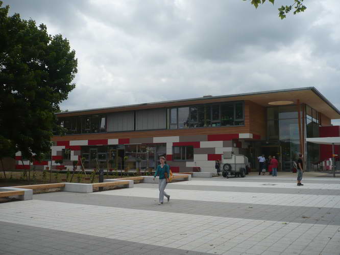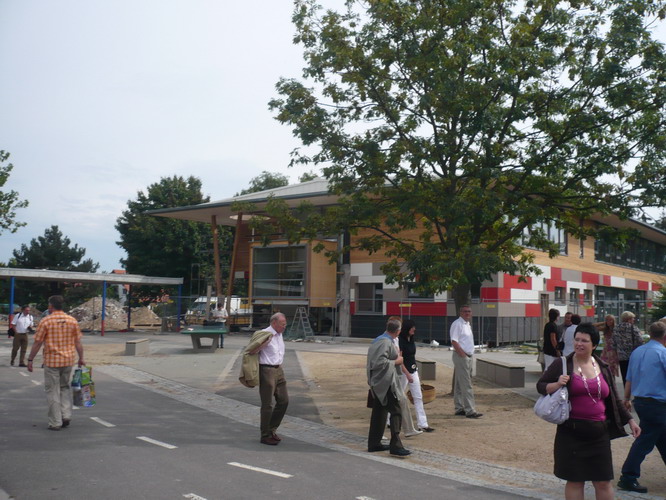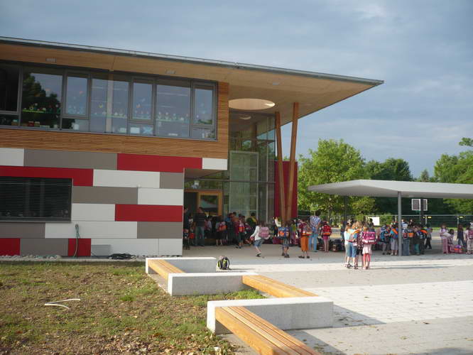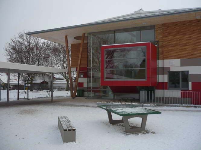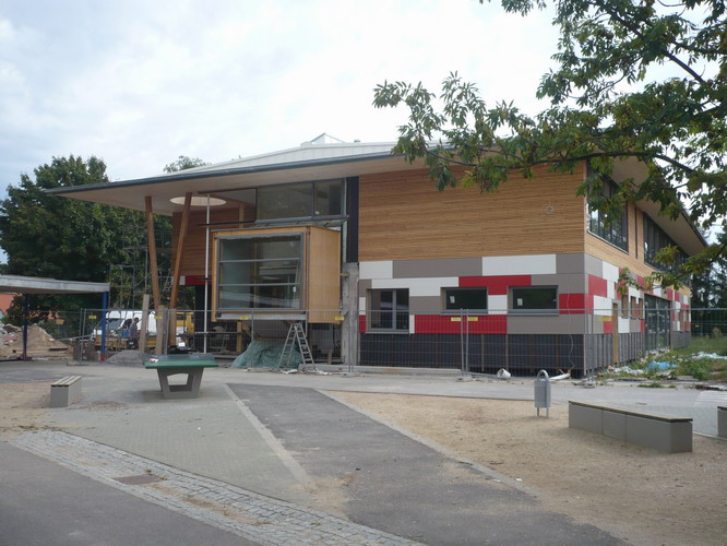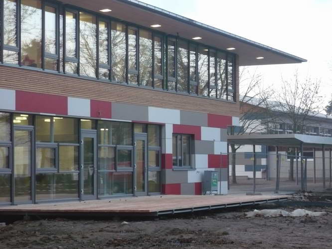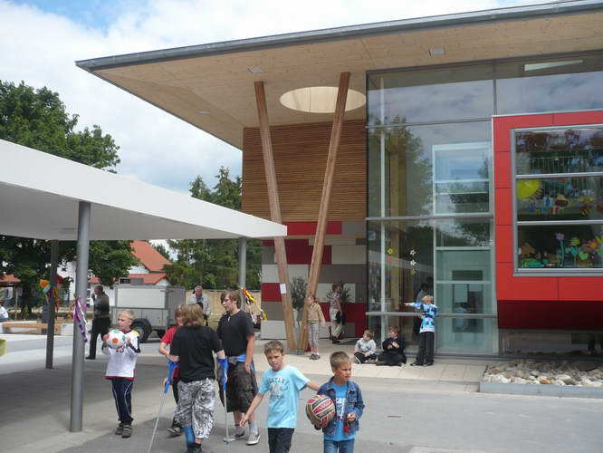 Home | Wir über uns | Projekte | Kontakt Schule in Holzbauweise mit Sonnenenergeinutzung Kennzeichen: - Schulgebäude zweigeschossig, aus einheimischem Holz - ökologische Ansätze - Niedrigenergiebauweise - Bauherr: Verbandsgemeinde Guntersblum - Technische Angaben zum Energieverbrauch siehe unten: Haben Sie dieses Haus schon einmal gesehen? Gut möglich, mit Sicherheit, wenn sie Schüler oder Lehrer der Schule in Guntersblum-Dolgesheim sind. Baubeschreibung Kurzbeschreibung Das Gebäude ist für eine 2-zügige Grundschule mit Ganztagesangebot einschl. dem notwendigen Verwaltungsbereich und einem Mehrzweckraum, gemäß dem geforderten Raumprogramm mit ca. 1385 m² BGF geplant. Es hat einen systematischen und regelmäßigen Aufbau und besteht aus 9 Achsen a 4,125 m, somit sind typisierte und vorgefertigte Bauteile kostengünstig einzusetzen. Die Schule ist zweigeschossig und als doppelbündige Anlage konzipiert. Im Erdgeschoss befinden sich neben einem überdecktem Zugangsbereich die Räume für Verwaltung, Ganztagesbereich mit Mensa, Küche und Mehrzweckraum, sowie die Nebenräume. Das UG des bestehenden Schulgebäu-des wird weiterhin für Technikräume verwendet und ist konzeptionell und konstruktiv berücksichtigt. Baubetrieb Durch die Holzkonstruktion konnte gegenüber einer konventionellen Massivbauweise ca. 6O % Energieeinsatz und damit verbunden entsprechend CO2 eingespart werden. Grundlage der Schätzung sind vergleichbare Untersuchungen. Architektur Der langgezogene rechteckige Baukörper ist mit einem flach geneigten Satteldach versehen. Dachüberstände zum Schutz der Fassade sind als integrierte Zusatzelemente angebracht. Der darunter liegende Baukörper ist kompakt angelegt, wird jedoch in den Bereichen der Sonderfunktionen wie Mensa, Mehrzweckraum und Eingangsbereich "transparent" und "offen" dargestellt. Die Fassaden sind entsprechend den Funktionen (Verwaltung, Klassenräume, Mensa) gegliedert und als solche ablesbar. Unterstützt wird dies durch die gewählte Konstruktion des Bauwerkes als Systembau, die Fassade ist mit hinterlüfteten farbigen Holzzement-Platten und Lärche- Schalung ausgeführt. Die Architektur und Gestaltung ist mit den Sanierungsmaßnahmen der Turnhalle in Einklang gebracht, d.h Materialien, formale Bauteile und Farben sind aufeinander abgestimmt. Konstruktion Das Bauwerk ist als Systembau mit hohem Vorfertigungsgrad von Bauelementen konzipiert. Vorherr- schend sind vorgefertigte Bauteile, sowohl als Massiv- wie auch als Holzleichtelemente mit inte-grierten Wärmedämmungen. Referenzobjekte: ( s. Schulplanungen in Höchst und Beerfelden Odw.). Energieeffizienz / Architektonisches - Energiekonzept Das Gebäude ist bedingt durch seinen kompakten Baukörper ( geringe Hüllflächen, bei großem Rauminhalt) und den Möglichkeiten wirksamer Wärmedämmlagen im gesamten "Hüllbereich" ( hinter-lüftete Dämmungen) äußerst energieeffizient auszuführen. Das Gebäude entspricht mit einem Heizenergieverbrauch von 0,24 W/m² K.(HT-Wert) den Niedrigenregiekriterien und kann bei Einbau einer kontrollierten Lüftung den Passivhaus-Kriterien entsprechen. Eine entsprechende Nachrüstung ist planerisch optional vorgesehen, durch Austausch von Füllungen in den Glasfassaden für dezentrale Raumlüfter als Gegenstromaggregate Es wurde bei der Planung darauf geachtet das eine optimale natürliche Belichtung möglich ist ( Fensterflächen, Dachflächenfenster, Ausrichtung, Gebäudekonfiguration ) um die elektrische Beleuchtung im Tagesbetrieb zu minimieren. Energieeffizienz / Sommerlicher Wärmeschutz Zur Regulierung von Wärmeenergie im Winter, wie auch zur Regulierung des sommerlichen Wärmeüberangebotes, sind zur Pufferung die Geschossdecke als Betonhohlkörperdecke und die Flurwände als schwere Klacksandsteinwände als Ausgleichsmassen ausgeführt. Wobei die Gesamtkonstruktion im Wesentlichen als Holzbau konzipiert ist. Über elektrisch temperaturgeregelte Dachflächenfester wird die sommerliche Überschussenergie abgeführt, nächtliches öffnen zur Kühlung mittels nachströmender kühler Luft ergänzen den sommerlichen Wärmeschutz. Alle Dachdämmungen bestehen aus Holzfaser- bzw. Cellulosedämmung zur Gewährleistung eines besseren sommerlichen Wärmeschutzes durch die Speicherfähigkeit des Materials gegenüber sonstigen Dämmungen ( Phasenverschiebung, ) . Die Dacheindeckung erfolgt mit einem weißen Trapezblech zur Reflektierung der Einstrahlung ( ca. 90 % ) sowie einer großen Hinterlüftungsebene mit Firstentlüftung zur Herstellung einer selbsttätigen Ventilation. Energieeffizienz / Regenerative Energienutzung Der Standort in Rheinhessen ( historischer Weinbau ) gehört zu den sonnenreichsten Gebieten in Deutschland, es bietet sich daher eine Nutzung der Sonnenenergie besonders an. Auf der Dachfläche von ca. 800 m² wird eine große Fotovoltaikanlage (ca.30 - 80 KW/ peak ) eingerichtet. Der geringe Wärmebedarf wird mittels eines kleinen BHKW ( Gas ) von 15 KW thermischer und 5 KW elektrischer Leistung erzeugt. Alle Beleuchtungskörper werden als Niedrigenergieleuchten ausgeführt. Ökologie / Nachhaltigkeit / Baumaterial Das Bauwerk besteht im wesentlichen aus Holz- bzw. Holzbaustoffen ( Wände, Dächer, Fenster, Türen, Fassadenverkleidungen im Innen- und Außenbereich . Die Wärmedämmungen werden auf der Basis von Holzfaserstoffen ausgeführt. Die Fußböden im wesentlichen mit Linoleum belegt, zur Minimierung von Farben ( schadstofffrei ) ist das Gebäude zum Wetterschutz mit großen Dach-überständen ( natürlicher Holzschutz ) ausgeführt. Somit stehen ökologische und natürliche Baustoffe im Mittelpunkt, die besonders kindgerecht sind. Diese Materialien sind bei einem Rückbau nicht nur entsorgungsfreundlich, sondern bei der Her-stellung und dem Verbau mit sehr geringem Energieeinsatz einhergehend. Wirtschaftlichkeit Durch den kompakten Baukörper, die Zweigeschossigkeit in Verbindung mit der zweibündigen Anlage, ergibt sich ein gutes Verh