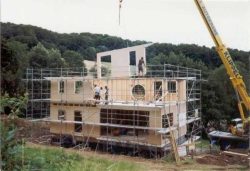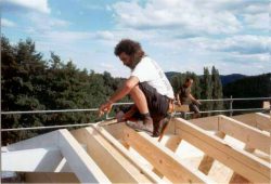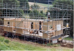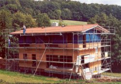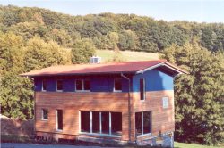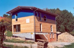 Home | Wir über uns | Projekte | Kontakt Kostengünstiges Holzhaus, Frau Dr. Weimar Kennzeichen: - Das Haus ist noch im entstehen! - Holzbau mit Holz aus umgebendem Wald - Kostengünstig - Hoher Eigenleistungsanteil - Passive Sonnennutzung - Pelletheizung - Solarkollektoren - Energieeffiziente Bauweise - Ökologische Bauweise Haben Sie dieses Haus schon einmal gesehen? Es ist gerade im entstehen! Allgemein Es, liegt am Anfang von Reichelsheim - Laudenau (Odw.) von Gumpen aus kommend, an einer Bergwiese gelegen, umrahmt vom Mergbach, der späteren Gersprenz, mit herrlicher Aussicht. Geologisch äußerst interessant ist die Bodenformation, handelt es sich doch bei dem Baugrund um ein "Felsenmeer", d.h. sehr große Findlinge (Granitsteine) stehen bis an die Erdoberfläche an. Diese Steine, die auch im nahen Bachbett bis zur Oberfläche reichen, sollen im Rahmen der Außenanlage Verwendung finden. Die Baufrau ist Ärztin in einer nahe gelegen Großklinik und will an diesem besonderen Ort ihre "Wurzeln schlagen". Kostengünstiges Bauen Der Kostenrahmen wurde eng abgesteckt, dennoch soll ein in allen Belangen solides und schönes Haus entstehen. Dies geht nur durch Vereinfachung und Beschränkung auf das Wesentliche ! So ist das Haus einfach und klar gegliedert, ohne kostenspielige Vor- oder Rückbauten, Gaupen usw. Das Dach ist leicht geneigt und bildet gleichzeitig die Decke über dem Obergeschoss. Der Keller ist als Teilunterkellerung ausgeführt - die restliche Fläche ist dreiseitig umschlossen offen und dient als Garage und Lager für Brennholz. Raumkonzeption Die Grundrisse sind ebenfalls so einfach wie der Baukörper, klar gegliedert und weitestgehend unabhängig von Stützen und Tragwänden. Somit kann ein variabler Grundriss einstehen ohne Einschränkungen. Die Grundfläche beträgt 7 x12 m, so entsehen im EG und OG ca. 16O qm Wohnfläche, zuzüglich UG. Ausreichend Platz auch für eine große Familie. Bauweise/Konstruktion Das Untergeschoss ist unter Ausnutzung der Hangsituation, halb freistehend und halb im Erdreich, eingegraben, mit Porotonsteinen 36,5 cm ausgeführt. Der Oberbau ist als Holzrahmenkonstruktion konzipiert und mit Holzdämmstoffen isoliert. Architektur/Ökologie/Baustoffe Der gesamte Baukörper ist mit einer Holzschalung in Odenwälder Lärche sägerau naturbelassen verschalt, im oberen Bereich kommt blau gestrichenes Sperrholz zur Verwendung. Alle Fenster sind aus Holz ,die Wände sind mit verzapften Holzständer hergestellt. Die Geschossdecke ist als sichtbare Holzbalkendecke ausgeführt, alle Dämmungen sind ebenfalls ökologisch mittels Holzcellulose ausgeführt. Bei der gesamten Konstruktion, wird auf schadstofffreie oder zumindest schadstoffarme Materialien geachtet. Die Wärmeversorgung erfolgt ebenfalls nach ökologischen Gesichtspunkten, s. unter "Energie". Landschaft/Außenanlage Das Haus wird von der Straße aus mittels eines filigranen Steges (Stahlkonstruktion mit Holzbohlung) erschlossen. Vor dem Wohnzimmer im Süd / Westbereich wiederholt sich dieses Bauteil als großflächige Eckterrasse; das Wohnzimmer kann hier später zu Gunsten eines Wintergartens erweitert werden. Die Talsituation mit Wiese, Felsen und Bachlauf soll erhalten bleiben, auf eine Außenanlage wird im Idealfall ganz verzichtet. Die Wiese wird weiter landwirtschaftlich genutzt, die Kuh macht muh! Energie Das Haus hat bedingt durch die Holzbauweise und der damit verbundenen Wärmedämmung einen niedrigen Energieverbrauch. Eine relativ einfache Heizung kann somit für ausreichend Wärme sorgen. Es ist an den Einbau eines Pelletofens gedacht, der zentral im Wohnzimmer steht und mit einem Wasserregister die kleinbemessenen Heizköper zusätzlich bedient. Durch den Standort des "Kessels" im Wohnzimmer, wird auch die Abwärme direkt genutzt, es entstehen keine Verluste. Ein Kachelofen ist für später vorgesehen. Für die Warmwasserversorgung wird eine kleine Solarkollektoranlage vorgesehen. Die Süd- und Westverglasungen dienen zur passiven Sonnenenergiegewinnung, die mit Wärmedämmrolläden geschlossen werden können. |